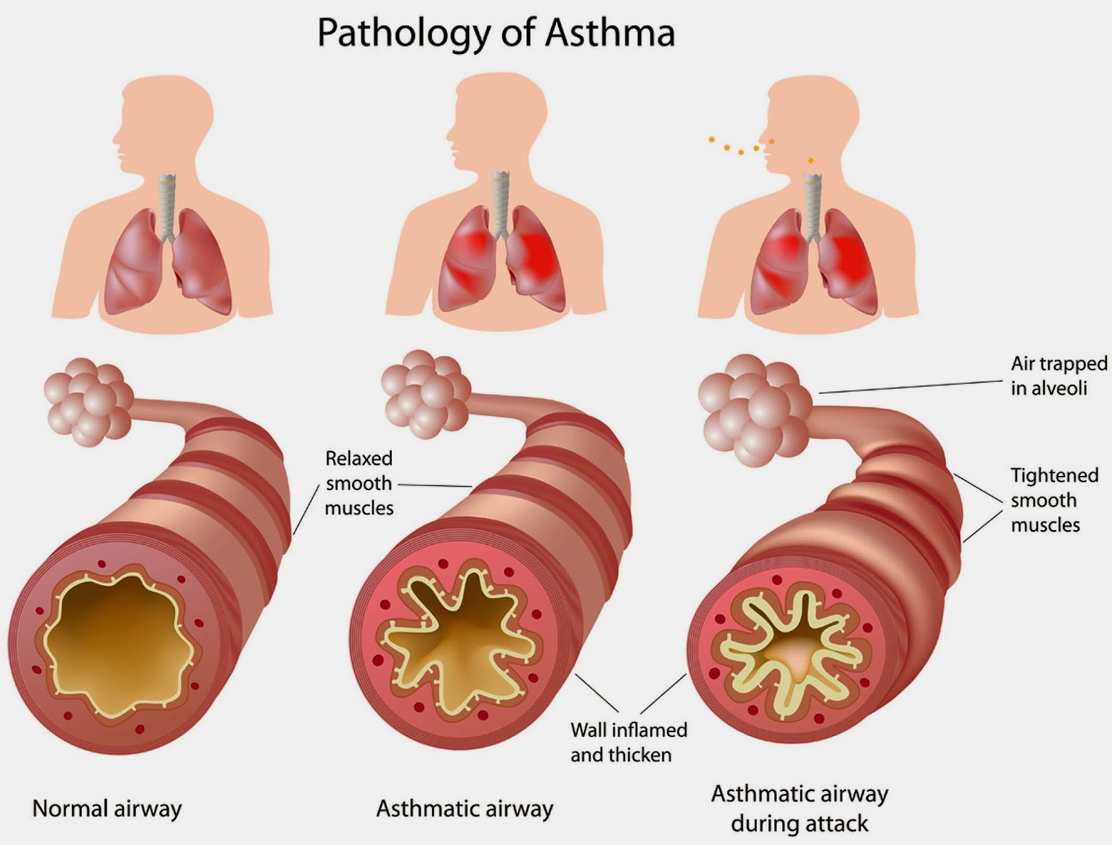 Το άσθμα είναι μια χρόνια αναπνευστική πάθηση που χαρακτηρίζεται από φλεγμονή των αεραγωγών, που προκαλεί προσωρινή σύστραση των αεραγωγών. Οι βασικές συμπτώσεις περιλαμβάνουν δυσκολία στην αναπνοή, πυρρός, τραχύτητα στο λαιμό και βήχα. Ο βήχας μπορεί να είναι ξηρός ή να συνοδεύεται από έκκριση.